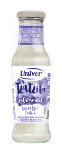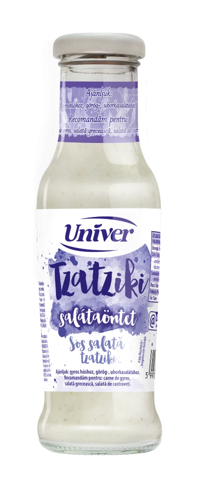 Univer Dressing Tzatziki 230 g to kremowy sos o świeżym, jogurtowo-ogórkowym smaku, który świetnie pasuje do gyrosa, kebaba, sałatki greckiej, sałatki ogórkowej i lekkich dań z warzywami. Dzięki połączeniu jogurtu naturalnego, ogórka, czosnku i ziołowych nut ma przyjemny, dobrze zbalansowany charakter i gładką konsystencję.